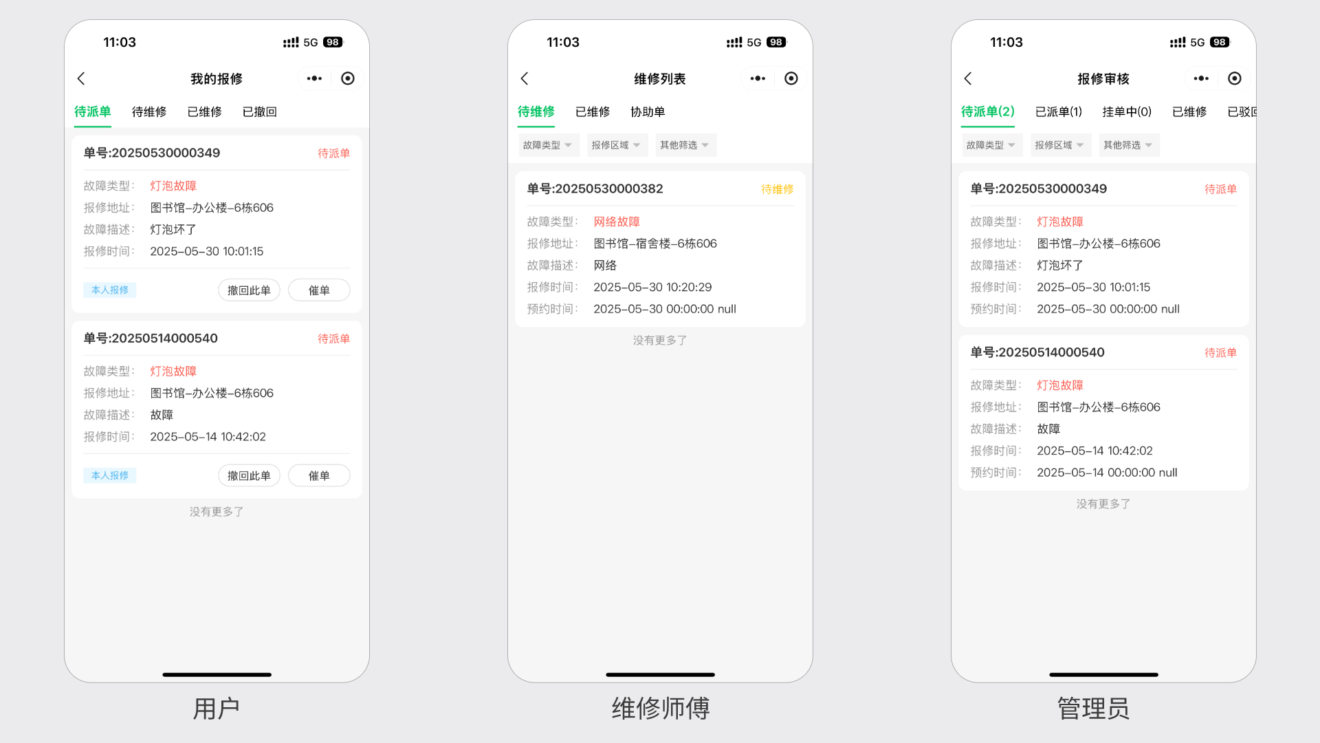用户可以实时查看维修进展,管理人员则能在后台随时掌握每一单的处理状态,有效解决“维修去哪了?”“进度谁来管?”的疑问。