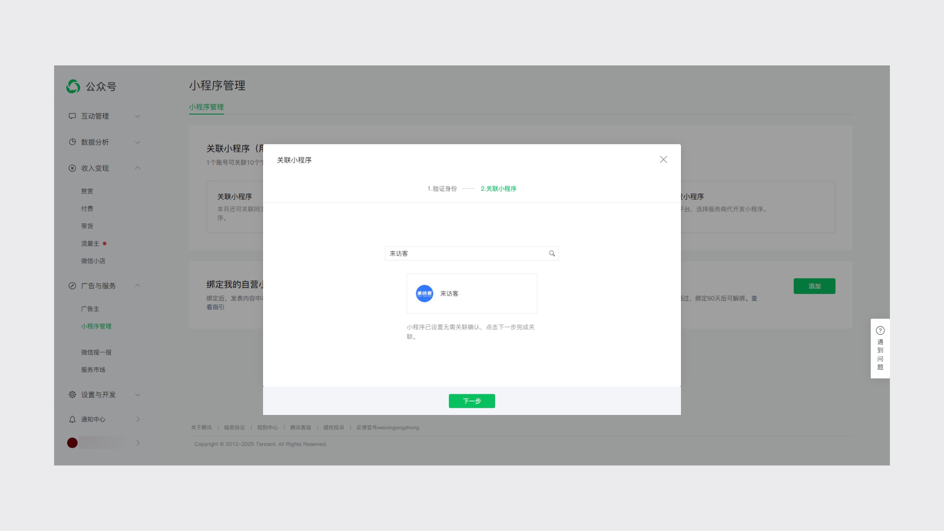 搜索“来访客”,点击搜索到的小程序【发送关联邀请】即可完成