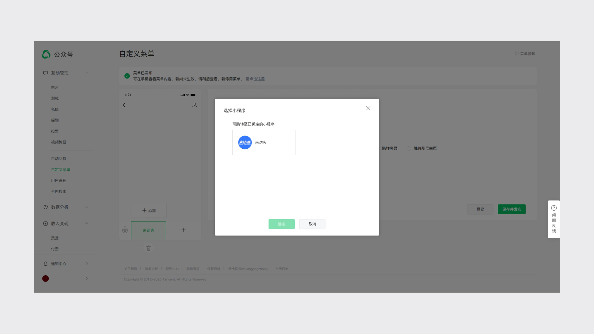 配置菜单跳转小程序,选择来访客