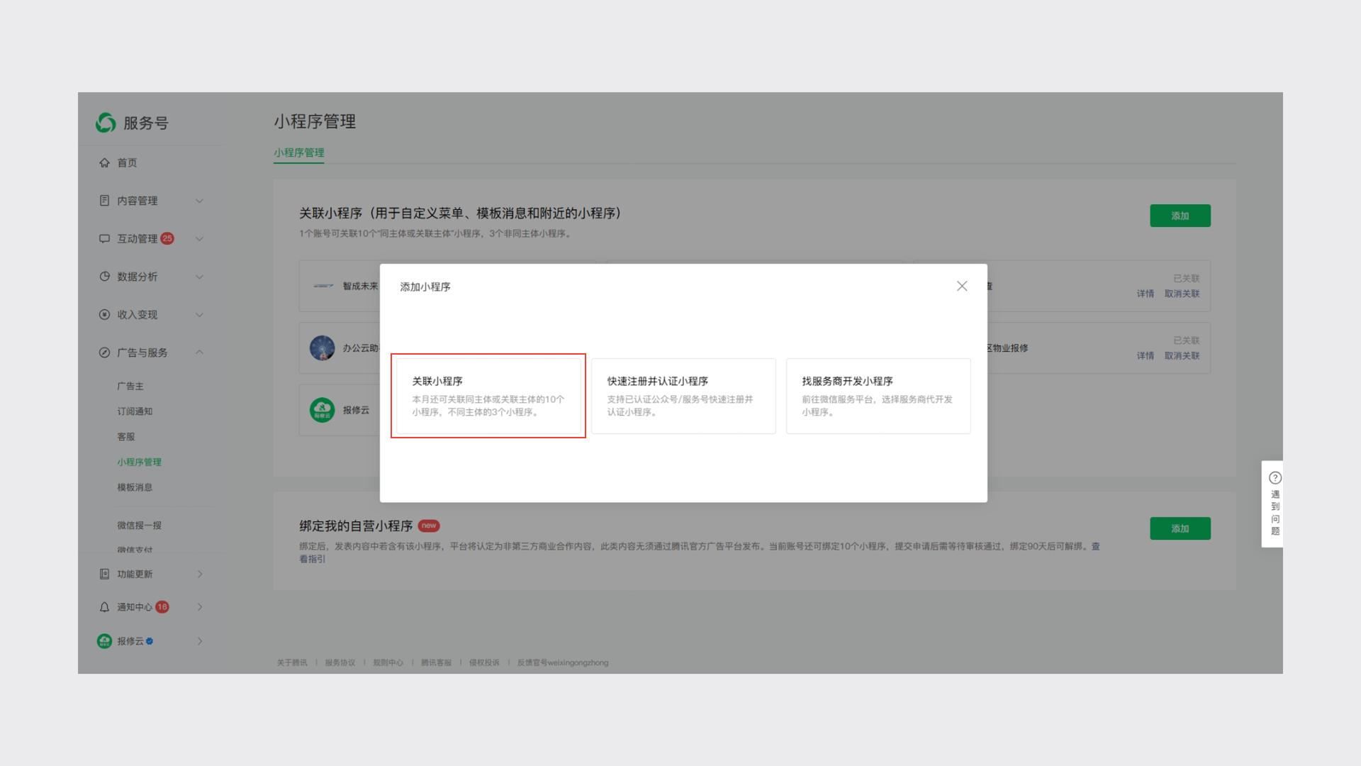 在左侧菜单点击“广告与服务”——“小程序管理”点击右下上角【添加】