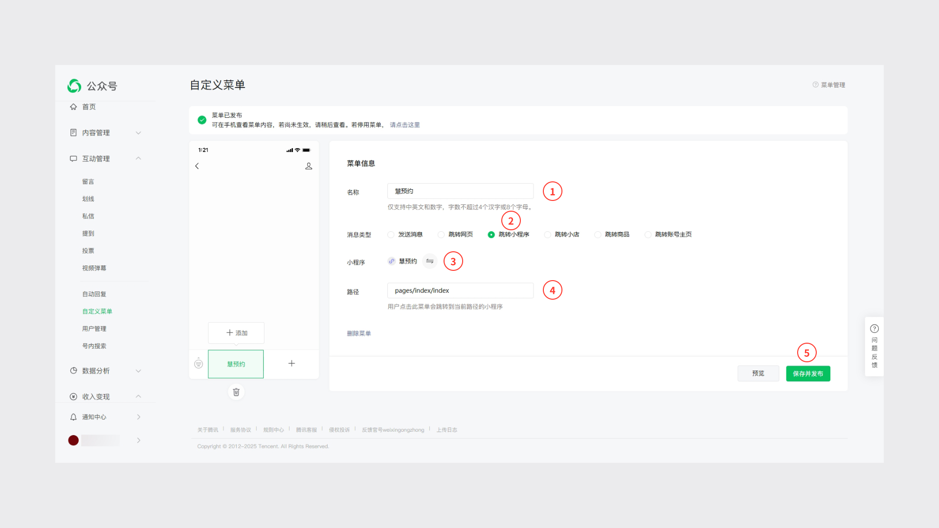 配置菜单跳转小程序,选择慧预约
