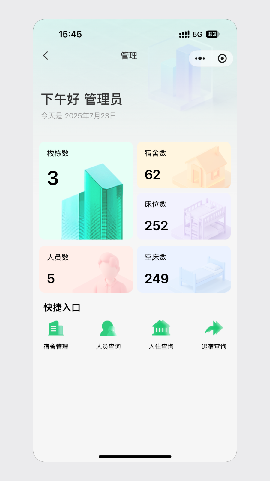 小程序支持多种角色:管理员、宿管、教师、入住学生,每个角色权限清晰,既保证了数据安全,又让管理分工更合理。