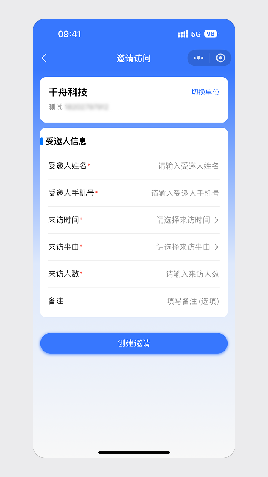 作为被访人,你也不用再发消息来回确认了,直接填写受邀人信息, 创建邀请后访客会收到邀请信息,来访流程一键搞定,接待更高效。